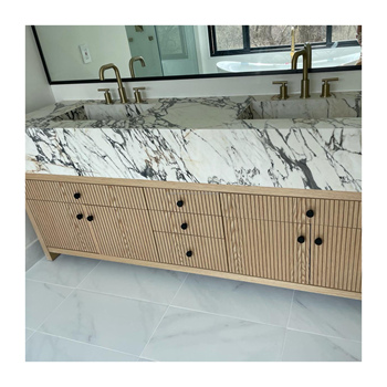 Fregadero de baño de mármol Calacatta Viola de lujo, gabinete de madera maciza estriado, diseño de tocador de mármol blanco, tocador de baño de doble fregadero